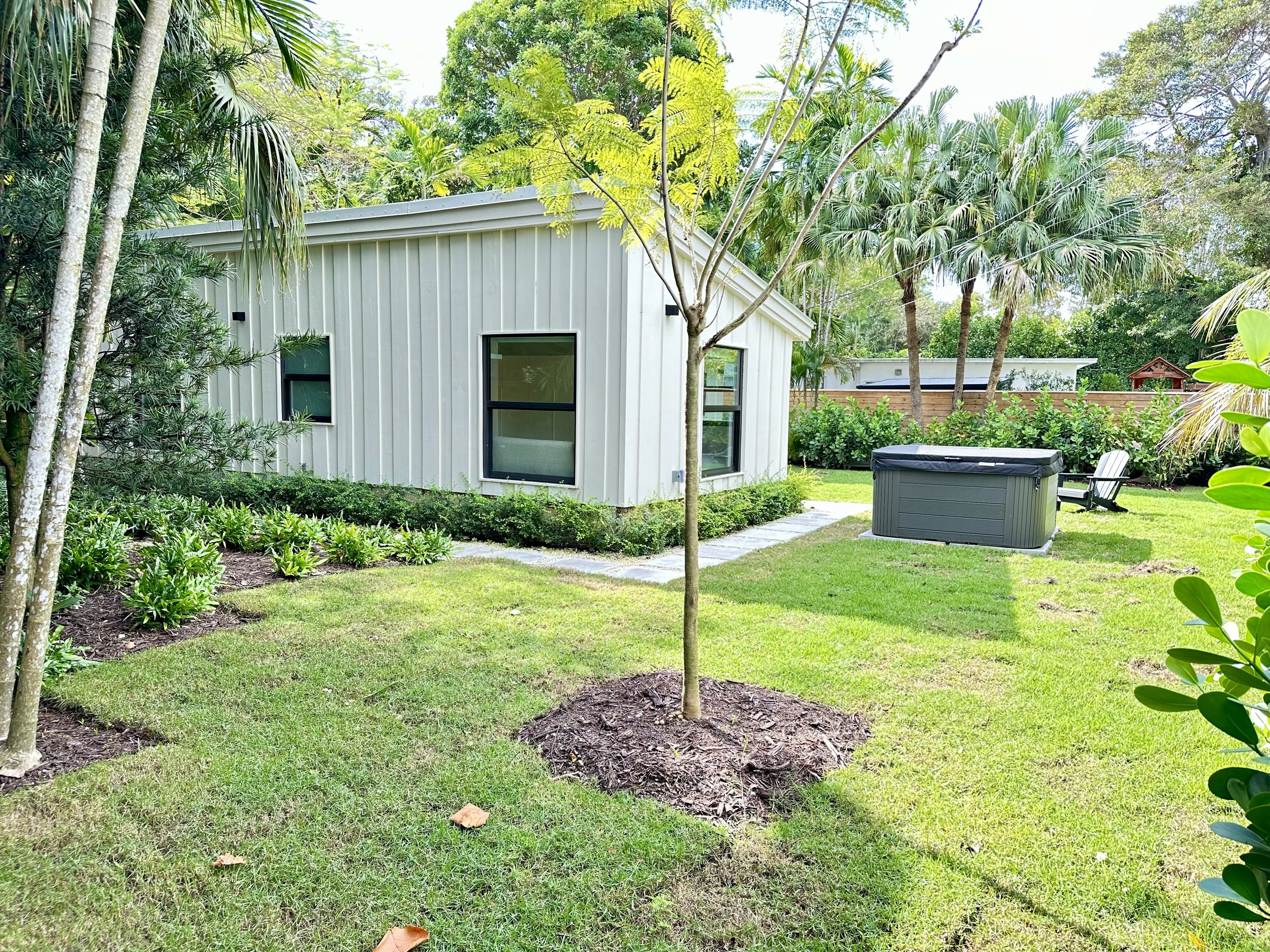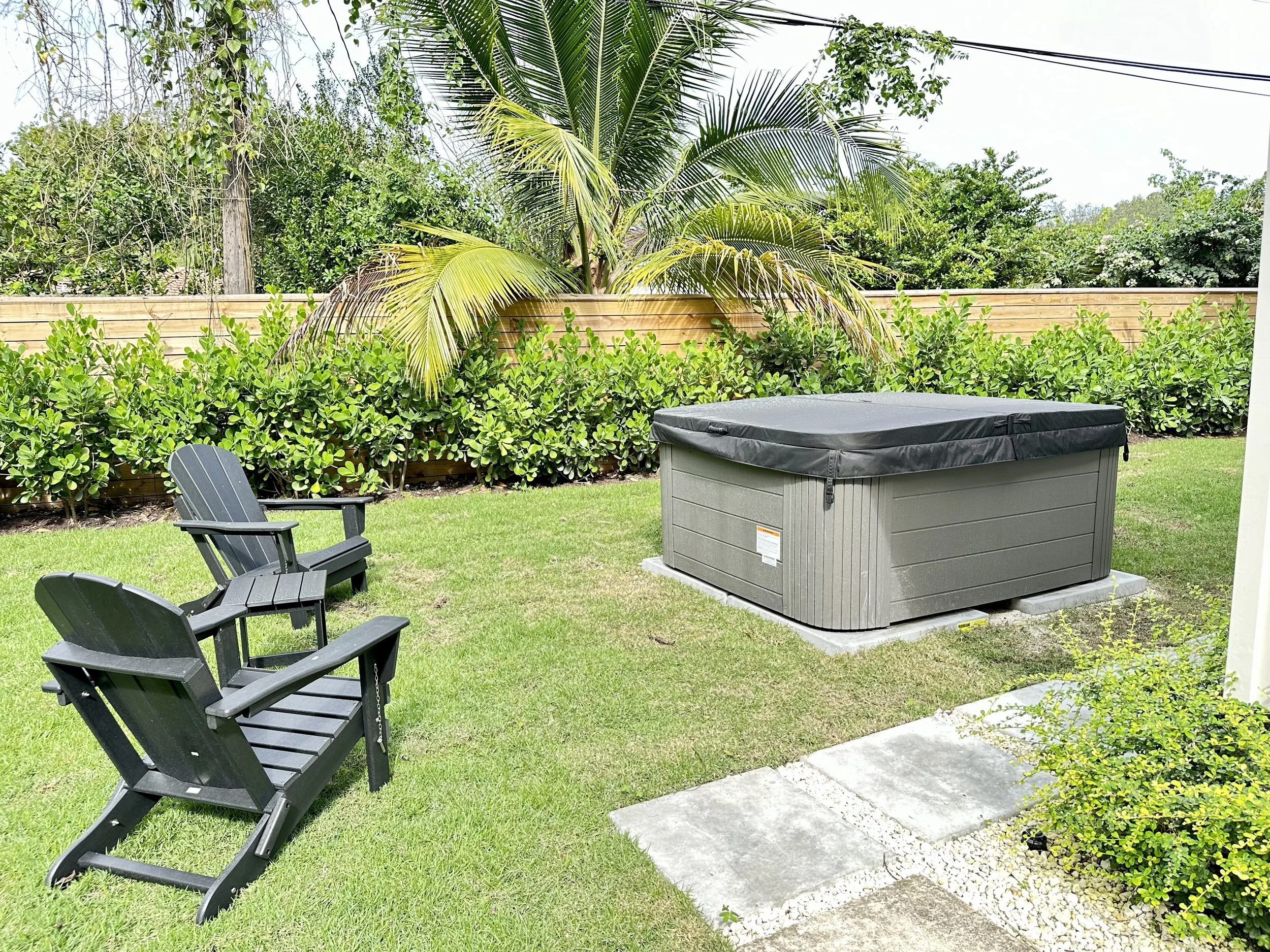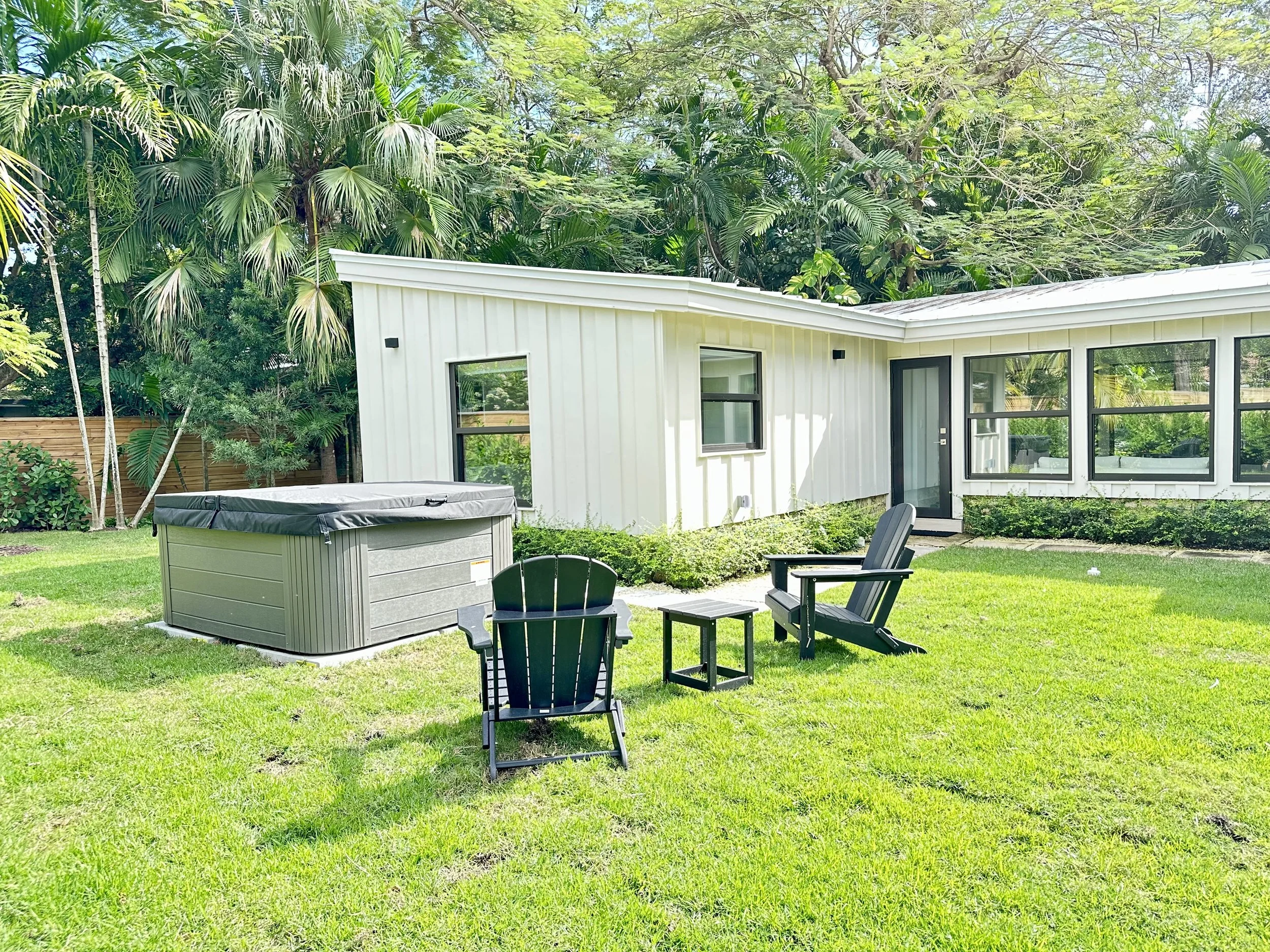 Outdoor amenities including a private backyard, dining terrace, jacuzzi, lounge chairs, and grill