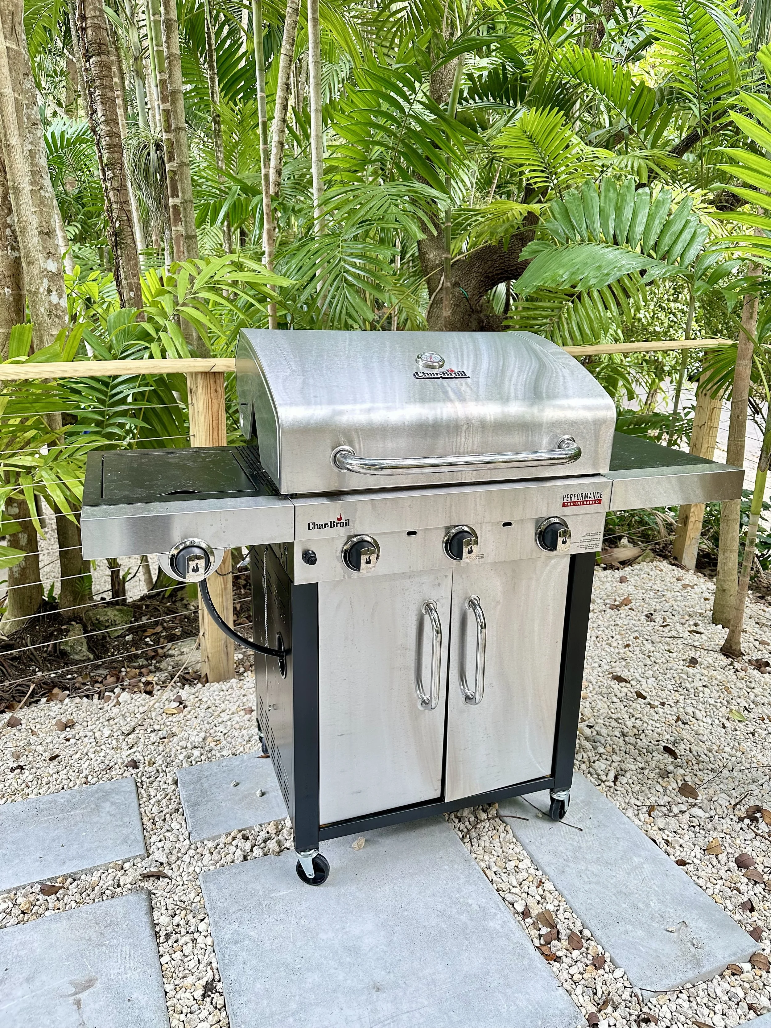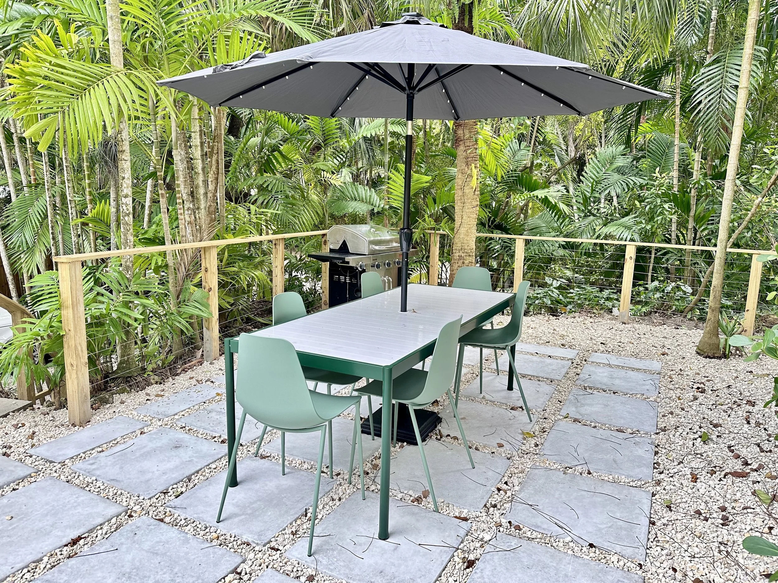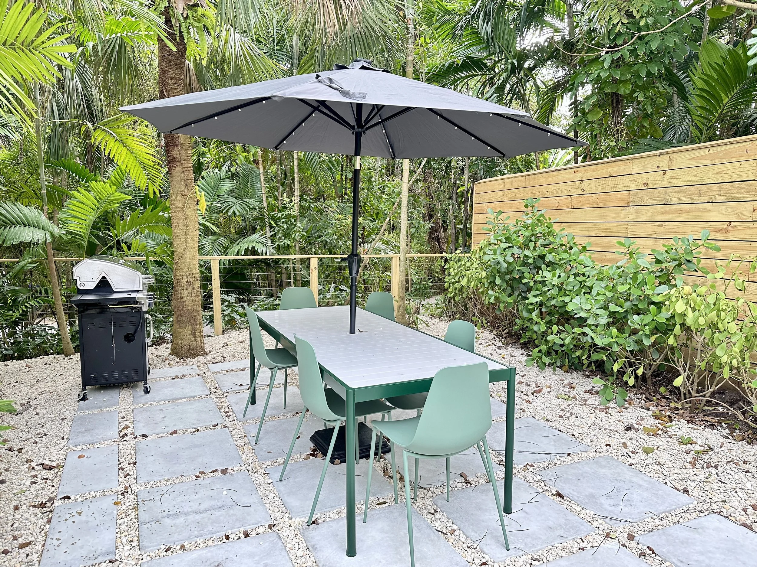 Outdoor amenities including a private backyard, dining terrace, jacuzzi, lounge chairs, and grill